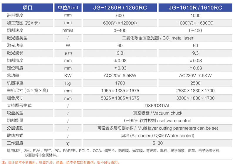 适用材料范围: 3M/PET/PC/PAPER/OCA/防窥膜/防爆膜/背光源/扩散/泡棉/光学薄膜/电子绝缘材料/皮革/双面胶/特殊材料石墨烯等